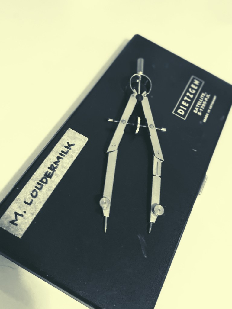 On our final day of the quarter, Mr. Henderson stood to remind us of how much he enjoyed teaching us and how impressed he was with our progress as drafts-people. But for what happened next, I was not prepared. He called me up to the front of the room. In his hand was a thin, black box. He then told everyone that I had turned in so many additional drawings, I had earned the highest grade in the entire class. He then handed me the box, my prize for this achievement. On the top it had small, white letters which said, “DIETZGEN – MADE IN GERMANY.” It appeared to be some sort of drawing tool. He instructed me to open it. Inside was the most glorious compass set I had ever seen. Lying in what reminded me of blue jewelry fabric were precision-crafted, shiny, aluminum, circle-crafting implements. The set had attachments I didn’t yet understand, so Mr. H briefly told me what they were: one for drawing in ink and another which allowed one to construct radii of much larger sizes. The gears which adjusted the width of the compass legs operated like a watch with extremely fine increments. The legs also had knee-like bends half way down their length to allow the pencil lead to sit perpendicular to the page. Unlike our standard-issue, tax-funded tools, these felt exquisite in your hand.
